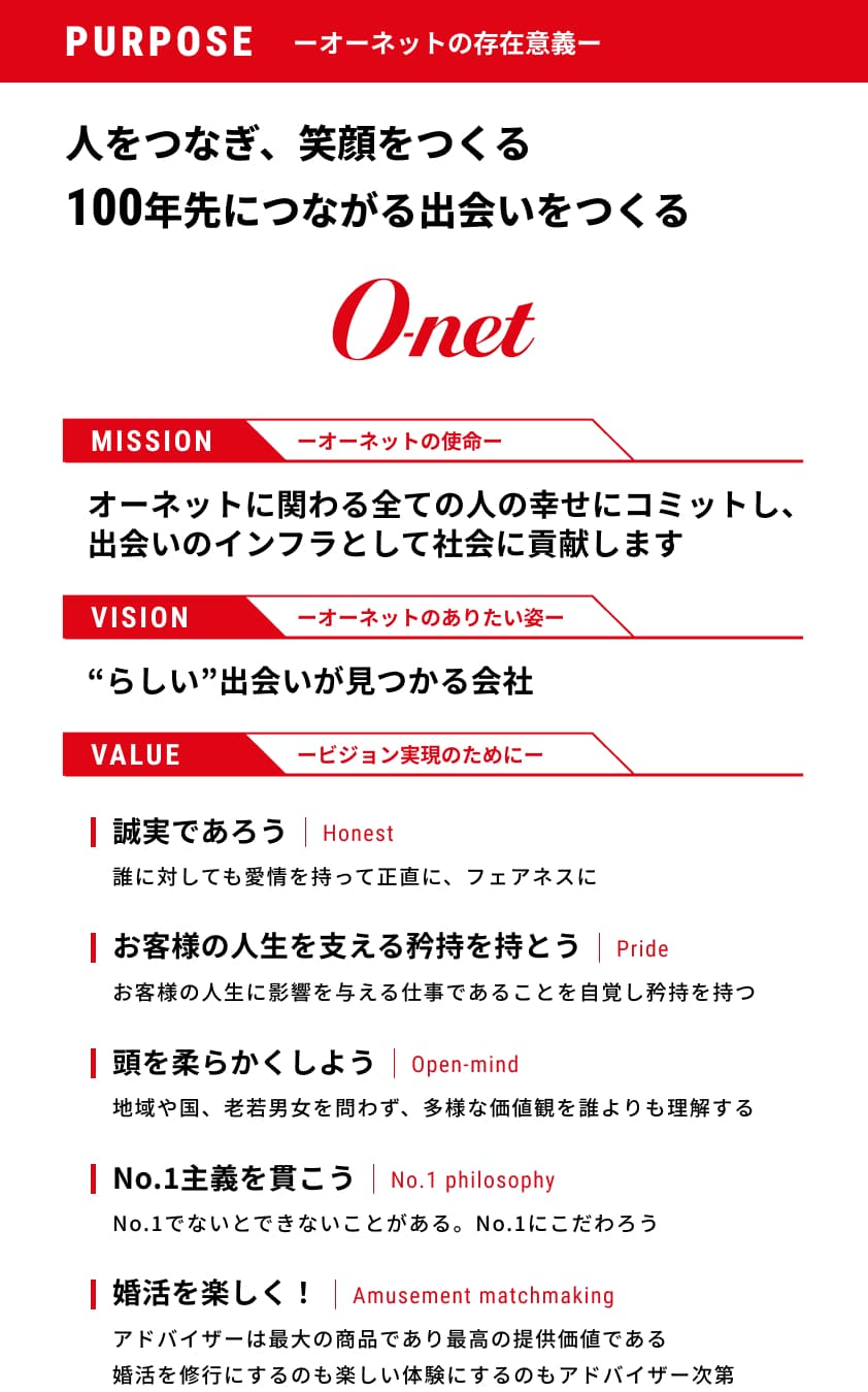 お客様へのサービス提供において、私たちは、お客様・会員様のご成婚に向け、各部門、各個人が協力し、全社をあげて取り組んでいきます。そのために、役職員一同十分なコミュニケーションを図り、お互いの立場を尊重し、理解し合い、信頼し合い、感謝し合う関係を重んじ、また、新入社員は全員で暖かく育み、組織として生産性向上と成長に取り組んでいきます。また、役職員一同が持てる能力を最大限発揮できるよう、また、成長できるよう、個々人の尊厳を 大切にし、心身共に健康で、安全かつ安心して、やりがいを持って働くことができる職場づくりに努めていきます。