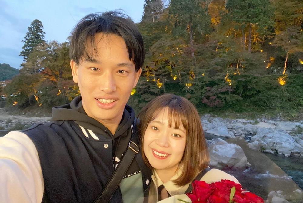 その旅行から1週間後、ふたりは紅葉が有名な香嵐渓に行く10回目のデートの約束をしていた。雅也さんはその日にプロポーズをするため、車のトランクにバラの花束を用意した。香嵐渓に着いてからプロポーズをする予定だったが、少しフライングして香嵐渓に行く前にお昼ご飯を食べたレストランの駐車場でプロポーズをしてしまった。