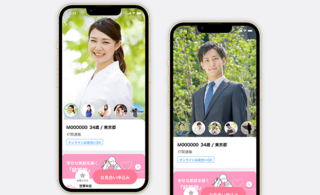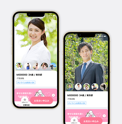 • ご自身で希望条件を入力・検索して選び、気になるお相手へ申し込みができます。マッチング成立後にお見合いへ進みます。